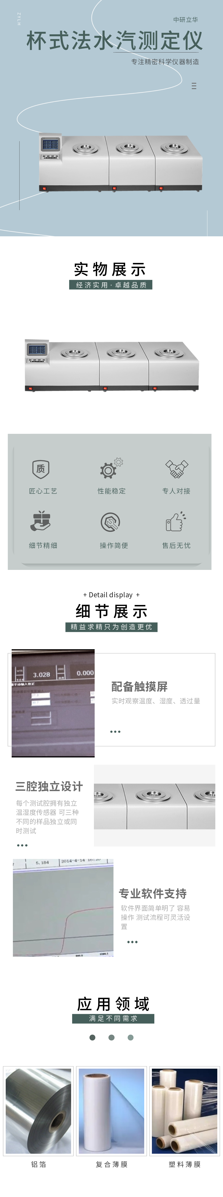 用途:測定薄膜或薄片材料的水汽透過率(量)用于塑料薄膜、復合薄膜、鋁箔、鍍鋁膜,各種片材、板材、橡膠、陶瓷,包裝容器。應用于質檢、藥檢、科研、包裝、薄膜、食品、藥品、電子等行業