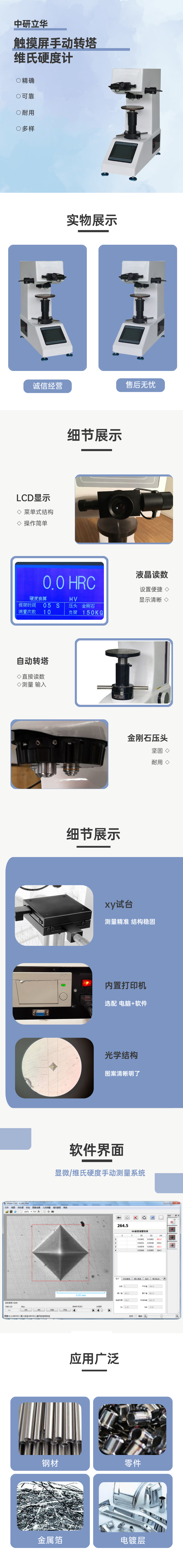 用途:主要用于各種金屬及部分非金屬材料的顯微維氏硬度測(cè)定,能夠?qū)Ω鞣N零件(機(jī)加工件、鍛件、鑄鐵、鑄鋼件等)、有色金屬、熱后處理零件等進(jìn)行硬度的測(cè)定。