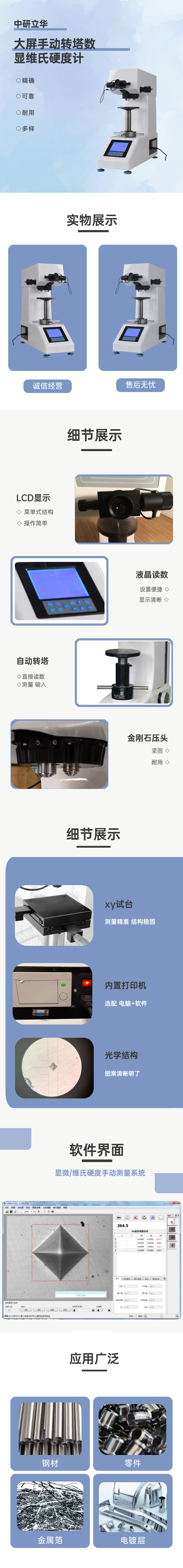 用途:主要用于各種金屬及部分非金屬材料的顯微維氏硬度測定,能夠對各種零件(機加工件、鍛件、鑄鐵、鑄鋼件等)、有色金屬、熱后處理零件等進行硬度的測定。