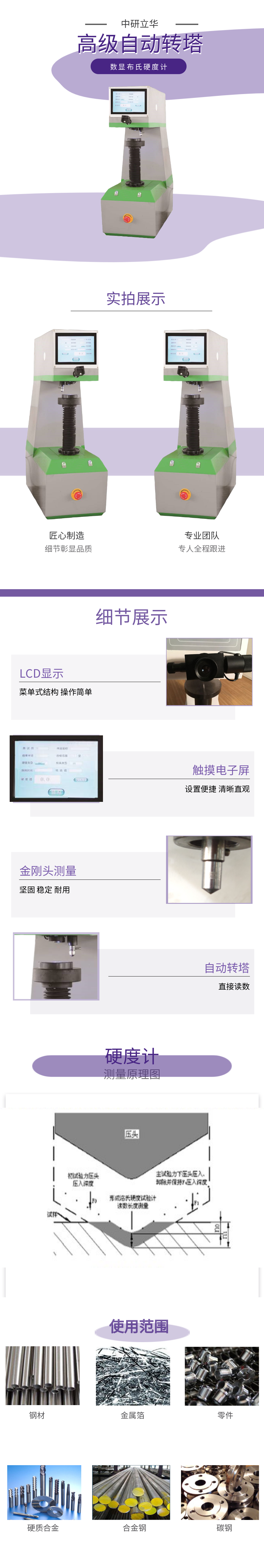 用途:適用于鑄鐵、鋼材、有色金屬及軟合金等材料的硬度測定,也適用于硬質的塑料、電木等某些非金屬材料硬度的測定。